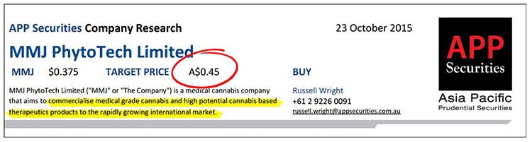 APP Securities Analyst Russell Wright has previously estimated that this alone could be worth $30 million in revenue per year from 2016. APP’s research note has a ‘Buy’ recommendation on MMJ and sees MMJ priced at $0.45 – 42% higher than its current price of $0.315: