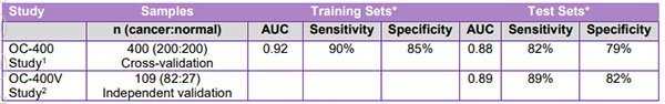 The objective of this study was to evaluate the robustness of the algorithm generated in the OC-400 study, by applying the test to an independent test set of 82 new ovarian cancers and 27 previously tested healthy controls.